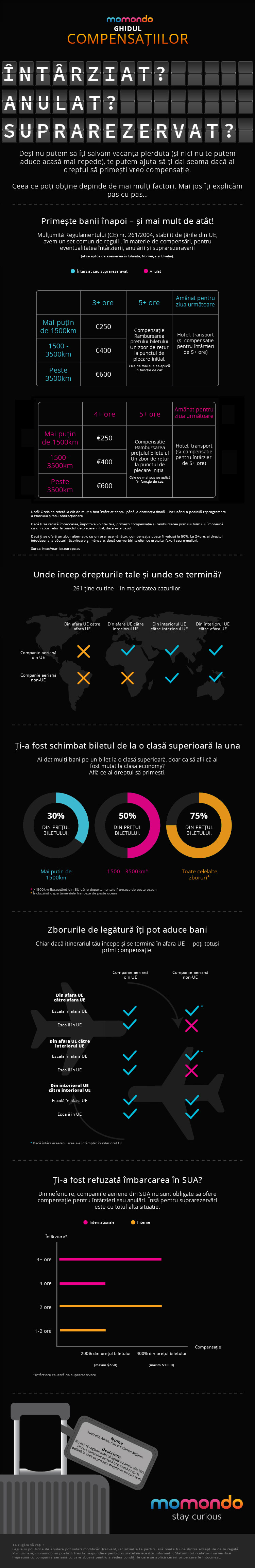 Ti-ai facut bagajele, ai parcurs un drum lung pana la aeroport, esti cu pasaportul in mana, ai trecut de check-in, esti atat de aproape de vacanta mult dorita si afli ca zborul tau intarzie, a fost anulat sau este suprarezervat. Specialistii momondo.ro au parcurs toate informatiile despre compensatie disponibile si au creat un infografic despre drepturile pe care le ai in aceste situatii.