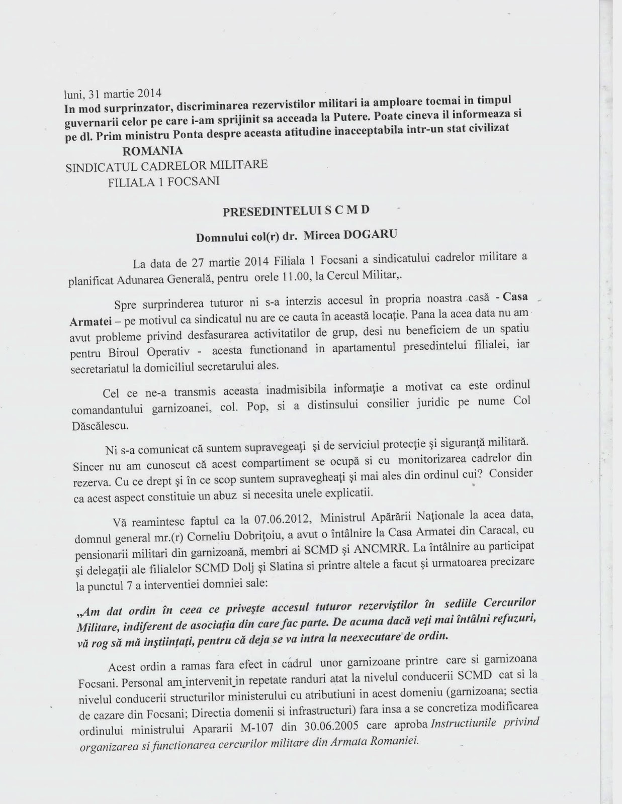 De la: _haakon_, la data 2014-04-25 17:16:14Comitetul Român pentru Cinstirea Eroilor vă transmite dvs. și, prin dvs., populației regiunii Crimeea și orașului Sevastopol felicitările noastre cu prilejul istoricului eveniment, întoarcerea la patria-mamă. Au aparut si reactii .cnsc-diaspora.blogspot.ro/2014/04/atitudini-antinationale-printr... joi, 24 aprilie 2014 Atitudini antinaționale printre unii membri ai CNSC Aflu din articolul publicat în România Liberă (www.romanialibera.ro/exclusiv-rl/investigatii/revolutionarii-din...) că două organizații membre ale Consiliului Național al Societății Civile își declară susținerea pentru acțiunile agresive ale Rusiei și îi condamnă pe românii cu vederi "occidentale" pe care-i denunță ca trădători. "Poziția mea este total opusă celor doi lideri Daniel Iancu și Petru Răcănel, deoarece, eu consider că Rusia constituie cel mai mare pericol și își menține caracterul dușmănos față de România și de poporul român, - prin ocuparea și ciopârțirea teritoriului României; - prin refuzul de a-și recunoaște vina față de poporul român pentru genocidul comis împotriva celor circa 1,2 milioane de români din teritoriile cotropite; - prin impunerea comunismului în țara noastră cu tancurile armatei sale de ocupație; - prin implicarea și presiunile pentru menținerea Basarabiei în afara teritoriului național român; - prin refuzul de a restitui tezaurul României; Orice sprijinire a politicii agresive a Rusiei, așa cum s-a manifestat și împotriva României de-alungul Istoriei, înseamnă servilism și trădare a intereselor noastre naționale. De aceea, în cazul in care CNSC nu ia atitudine publică, nu se delimitează și nu exclude cele doua organizații: "Federația Societatea Civilă Românească" și "Comitetul pentru Cinstirea Eroilor", vă rog să considerați că eu nu mai sunt afiliat în niciun fel cu CNSC. Menținerea lor tacită și lipsa de reacție ar însemna solidaritatea CNSC cu poziția antinațională a respectivelor organizații. În consecință, vă voi ruga să ștergeți numele meu din lista Coordonatorilor Consiliului Național al Societății Civile." Cu respect, Mircea Popescu 24 Aprilie 2014 Raporteaza abuz de limbaj |