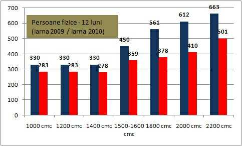 Pe segmentul de persoane fizice, analiza a fost efectuata pe baza preturilor minime pentru fiecare categorie de capacitate cilindrica a motorului, luandu-se in considerare un asigurat fara daune, cu varsta de peste 30 de ani.