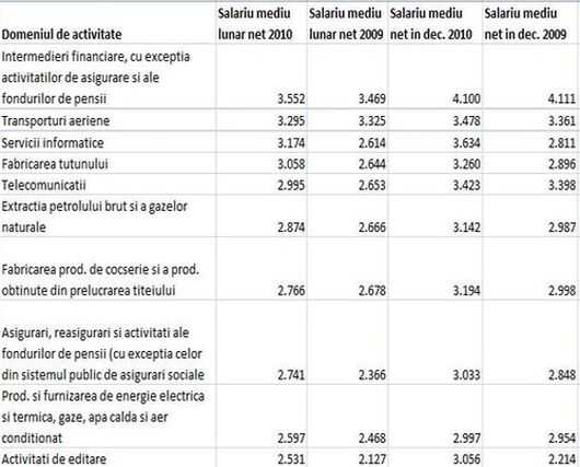 Chiar daca si 2010 a fost un an de criza si reduceri salariale, din datele INS se observa o crestere a remuneratiilor lunare ale angajatilor din cele mai bine platite zece domenii.