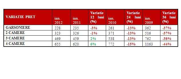 In cazul apartamentelor de 3 si 4 camere, ianuarie 2012 a marcat prima crestere a chiriilor la inceput de an din 2008 si pana in prezent. Dupa 3 ani consecutivi in care pe intervale de 12 luni preturile au inregistrat scaderi, chiria solicitata de proprietari pentru un apartament de 3 camere a ajuns acum la 469 euro/ luna, cu 2% mai mult decat in ianuarie 2011.