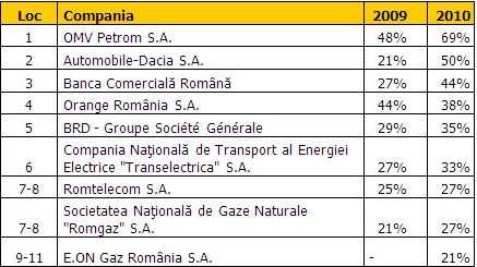 Automobile-Dacia (50%) si Banca Comerciala Romana (44%) se afla pe locul secund si al treilea din Romania. Spre deosebire de anul trecut, Automobile Dacia a aratat o imbunatatire scorul sau crescand de la 21% la 50%.