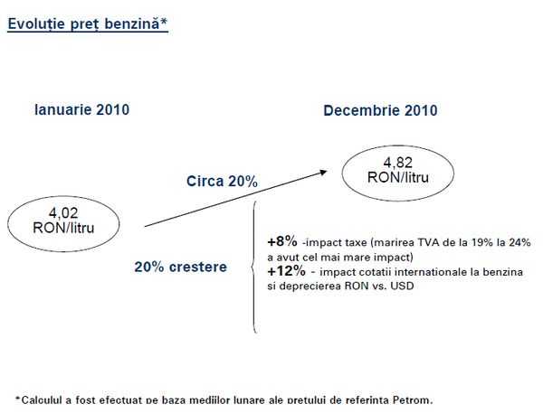 Conform datelor prezentate de companiile petroliere, a rezultat ca, in cursul anului 2010, ponderea taxelor in structura pretului la pompa a scazut de la 52,5% la inceputul anului la 49,8% la sfarsitul perioadei (inclusiv in contextul cresterii TVA la 24%), aspect de natura sa certifice faptul ca nivelul de crestere al preturilor la pompa nu poate fi justificat din punct de vedere al unei poveri fiscale.[Preturile carburantilor, umflate "cu pompa"]