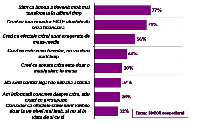 Desi la nivel personal oamenii o resimt mai putin, exista perceptia ca totusi criza financiara pare sa cuprinda din ce in ce mai mult tara noastra. La ora actuala starea generala pare a fi una de tensiune si asteptare legata de ceea ce se intampla in jurul lor. Aceasta stare se datoreaza faptului ca 2/3 dintre romani afirma ca nu au informatii concrete si nu stiu exact ce inseamna criza atat de des amintita. Se pare chiar ca mai mult de jumatate dintre ei considera ca totul ar putea fi o exagerare de moment din partea mass-media, tocmai datorita lipsei resimtirii unor efecte directe aspupra propriei persoane. Romanii observa mai degraba efectele crizei la cei din jur si mai putin asupra lor. Prin urmare tara este afectata, dar eu ca individ mai putin.