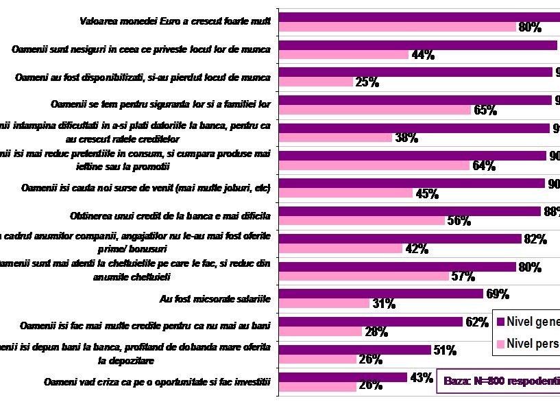 Astfel dintre efectele asociate crizei, romanii au constatat ca cei din anturajul lor isi fac din ce in ce mai multe griji in ceea ce priveste stabilitatea locului de munca (94%), pe cand din randul celor intervievati doar 44% au fost afectati in mod direct. De asemenea exista perceptia ca oamenii au inceput sa intarzie in achitarea datoriilor catre banci (91%), dar in mod direct doar 38% se confrunta cu aceasta problema. In ceea ce priveste gasirea unei surse de venit suplimentare doar 45% au luat in considerare aceasta posibilitate, dar uitandu-se la cei din jur perceptia asupra procentului celor care au inceput deja ca caute este mult mai mare, si anume 90%. Putini dintre ei ar privi criza ca o oportunitate pentru a face diferite investitii in aceasta perioada (26%).