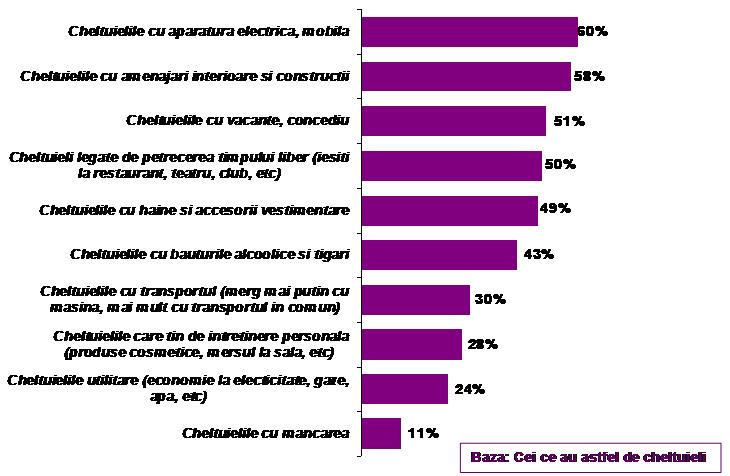 In ceea ce priveste ariile in care romanii mai degraba ar economisi, pe primul loc se gasesc cheltuielile legate de constructia si dotarea locuintei (in jur de 60% din cei ce aveau astfel de cheltuieli), urmate de cele destinate petrecerii timpului liber (vacante, iesit in oras) – aproximativ 50% din cei ce aveau astfel de cheltuieli. Economisirea nu inseamna insa si renuntarea totala la aceste produse ci mai degraba gasirea unor solutii mult mai convenabile (promotii, oferte, destinatii mai accesibile). Se pare ca romanii nu sunt pregatiti sa se intoarca la un stil de viata mai auster si sa abandoneze anumite standarde cu care s-au obisnuit tocmai de aceea se vor adapta la contextul crizei cautand preturi mai mici. Produsele la care in schimb nu vor renunta si pentru care vor reduce cel mai putin cheltuielile sunt cele alimentare (doar 11% vor reduce acest tip de cheltuieli), utilitatile (doar 24%) si produsele de ingrijire personala (doar 28%). De asemenea, pentru cei care au masina aceasta ramane in continuare principalul mod de locomotie (70%), nevazand folosirea mijloacelor de transport ca o modalitate de a economisi bani.