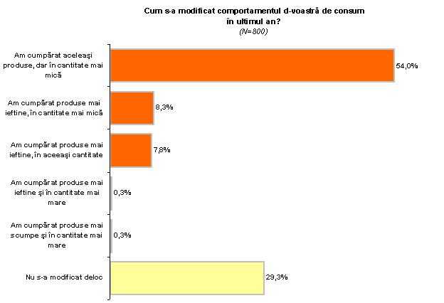 In acest context, datele studiului citat releva faptul ca modificarea comportamentului s-a facut in doua directii: cumpararea produselor in cantitate mai mica si, pe langa aceasta, cumpararea produselor mai ieftine.