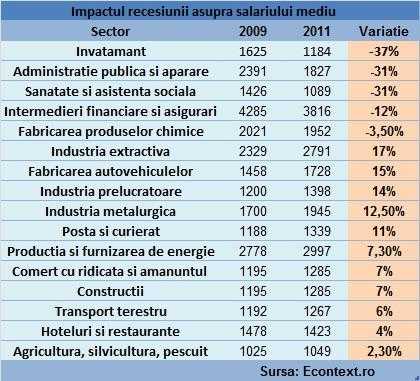 Astfel, cel mai ‘lovit’ domeniu a fost invatamantul. De la inceputul si pana la finalul recesiunii (din 2009 si pana la inceputul anului 2011, inainte de fi indexat cu 15%), salariul mediu din invatamant a scazut cu 37%! La 1 ianuarie 2009, salariul mediu din invatamant era de 1.625 lei, iar la inceputul anului 2011, salariul mediu din acest domeniu se situa la 1.184 de lei. Ceea ce inseamna o scadere de 37%.