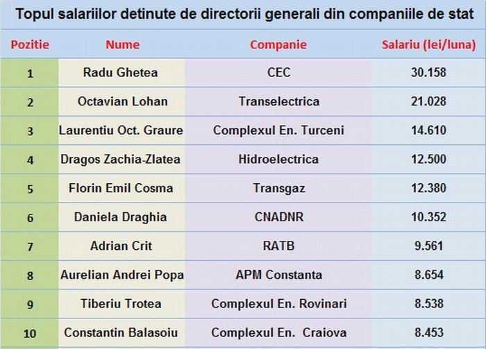 Ghetea este urmat de Octavian Lohan de la Transelectrica, cu o leafa lunara de 21.028 lei (5.000 de euro). Un salariu confortabil incaseaza si Laurentiu Octavian Graure, directorul general al Complexului Energetic Turceni, care vine acasa cu 14.610 lei pe luna.