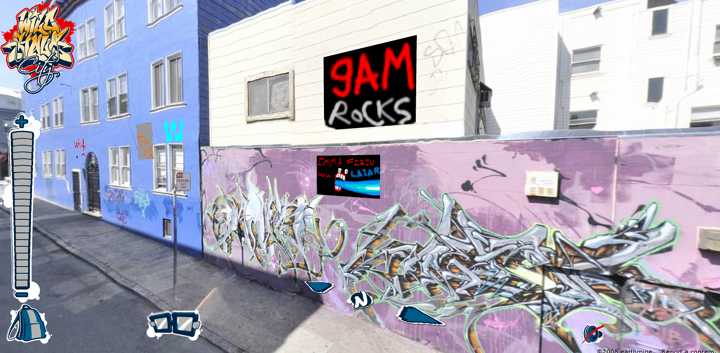 Ca sa-si asigure presa internationala, dovada ilustratia acestui articol, Earthview a ales sa ii invite pe toti internautii sa se joace cu o aplicatie in Flash care le pune la dispozitie un rucsac echipat cu o harta, un spray si o lista a celor mai populari grafferi. San Francisco are in anumite cartiere peretii plini, deja, de tag-uri, bomb-uri si throw-uri virtuale pe care, desi nu se face sa "dai peste", poti sa le acoperi linistit. Dupa cum se poate vedea mai jos, distinctia dintre desenele din realitate si cele aplicate cu mausul este evidenta, iar cablurile atarnate peste tot arata familiar.