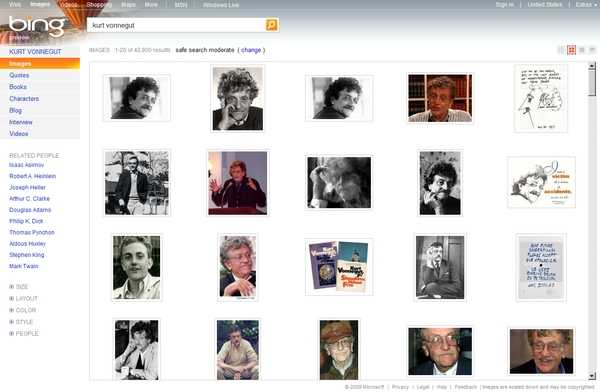 Interfata Bing este aerisita si imparte ecranul, dupa introducerea termenului de cautare, in trei zone distincte. In timp ce coloana dreapta genereaza rezumate de cateva randuri pentru fiecare rezultat, coloana din stanga afiseaza o serie de criterii de sortare in functie de tipul continutului gasit. Astfel, imaginile pot fi filtrate dupa marime, layout si culoare, o optiune interesanta, prezenta deja pe Google Images, impartindu-le in functie de felul lor (fotografii sau ilustratii) si o alta analizand continutul prezent si putand sa afiseze, de exemplu, doar imagini in care apar fete de oameni sau doar capete si umeri. Plimbarea mausului deasupra continutului grafic adauga si criteriul "imagini similare".