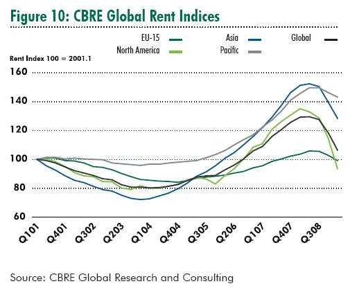 - in Asia, reducerea personalului din servicile de afaceri si din sectorul financiar, combinat cu nevoia reducerilor de costuri au condus la o scadere a cererii pentru spatii de birouri prime, determinand prabusirea ratei de ocupare pe cele mai multe piete. In regiunea Pacificului, increderea investitorilor din Australia si Noua Zeelanda a continuat sa se diminueze si in consecinta activitatea de investitii a scazut cu mult sub valorile medii pe termen lung.