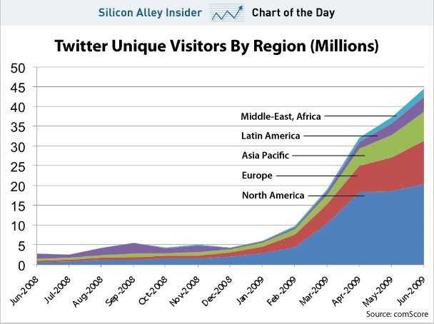 In iunie, Twitter a atras 11 milioane de vizitatori din Europa, 7 milioane din zona Asia-Pacific si 4 milioane din America Latina- un total de 22 de milioane de unici din aceste 3 regiuni, cu peste 2 milioane mai mult decat in 2008. Trebuie sa tinem cont de faptul ca aceste date arata traficul web de pe Twitter.com si nu include traficul via telefoane mobile, mesaje text, etc. Cu alte cuvinte nu este o masuratoare directa a membrilor Twitter, insa acuratetea este foarte crescuta, dupa cum afirma specialistii citati de Bussiness Insider.