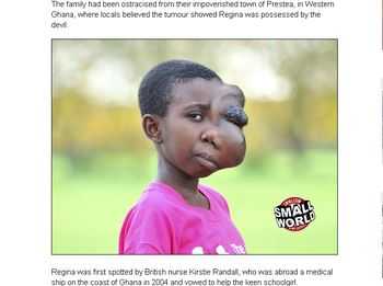 Regina Abbae, in varsta de 13 ani, s-a nascut cu o fata normala, insa la doua saptamani de la nastere parintii au observat pe obrazul stang al micutei o umflatura ce tot continua sa creasca, scrie swns.com.