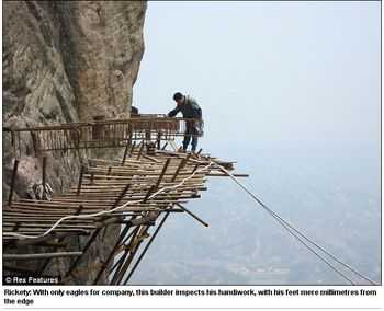 Astfel, DailyMail a publicat o serie de fotografii cu muncitori chinezi care construiesc un drum din scanduri pe muntele Shifou la o inaltime de mii de metri, unde multi nici nu ar avea curajul sa mearga.