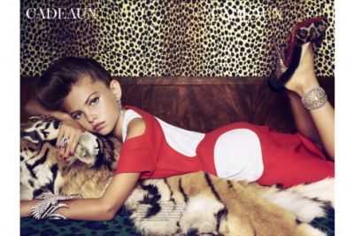 pentru Jean Paul Gaultier la patru ani si a aparut chiar si aproape topless. Desi multe din fotografiile sale sunt potrivite varstei, o parte din ele depasesc orice limita, ca cea in care apare machiata, cu tocuri si intinsa pe o canapea cu imprimeu de leopard. (Sursa foto1 : thegloss.com)Descoperire șocantă: 13 supermarketuri din București închise pentru...
