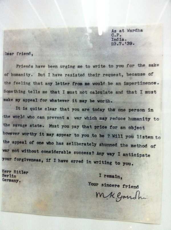 Cu o luna inainte ca Polonia sa fie invadata de Germania, la insistentele prietenilor – cum scrie si in scrisoare, Gandhi i s-a adresat lui Hitler.