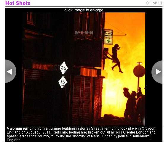 Tanara din imagine suprinsa intr-o fotografie aparuta pe prima pagina a cinci publicatii nationale in timp ce sarea de la primul etaj al unei cladiri din Croydon, in sudul Londrei, incendiata de protestatari, ar fi fost salvata de un roman.