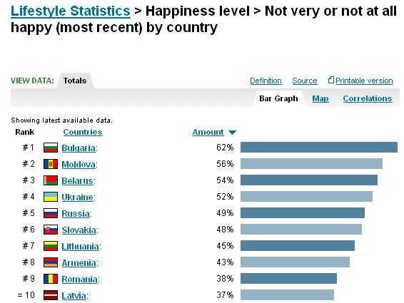 62% dintre bulgari se declara "nefericiti" sau "foarte nefericiti". Pe locul doi in topul nefericirii se afla locuitorii Republicii Moldova: 56% din populatia tarii se declara "nu foarte fericiti" sau "deloc fericiti".