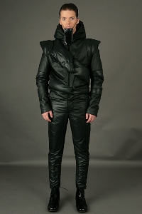 Cine a spus ca matlasat nu poate fi glamour? Olah Gyarfas reuseste sa proiecteze aerul agresiv al pielii negre fisului inofensiv. Remarcabila geaca 2-in-1 cu vesta detasabila (fiecare piesa putind fi purtata separat) imbina imprevizibil confortul (captuseala cu pene) cu o incredibila alura retro hard-rock.