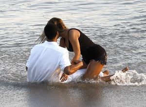Cei doi protagonisti se lasa "purtati de val" in timp ce transpun scena reprezentativa romantismului pe plaja, in care Burt Lancaster si Deborah Kerr se saruta cu pasiune.