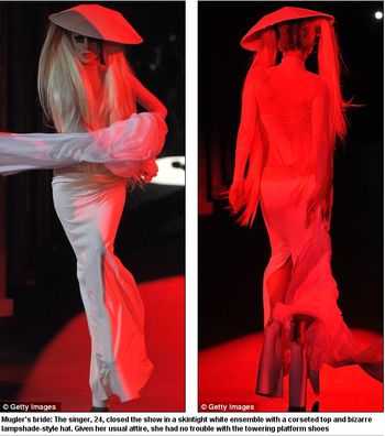 Lady Gaga a purtat doua tinute semnate de creatorul Thierry Mugler: prima a fost o rochie neagra transparenta in partea de sus, asoratat cu o palarie inspirata din uniformele militare, si a doua a fost o rochie de mireasa, cu corset si palarie, scrie dailymail.co.uk.