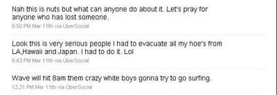“Valul o sa loveasca pe la ora 08:00, baietii aia albi o sa incerce sa faca surfing”, a fost primul mesaj postat de rapper vineri dimineata iar cateva ore mai tarziu, cand intreaga lume se ingrozea de ceea ce se intampla in Japonia, 50 Cent a postat un nou comentariu ironic: “Oameni buni, este foarte serios ce se intampla, a trebuit sa imi evacuez toate fetele mele din L.A., Hawaii si Japonia. Am fost nevoit. Lol”.