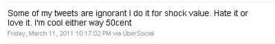 Insa, “minunea” nu a durat foarte mult si 50 Cent a revenit la ironii si a scris tot pe pagina sa de Twitter: “Unele din mesajele acestea sunt ignorante, le fac publice pentru socul pe care le creeaza. Le urati sau le iubiti. Eu oriucm sunt cool , 50 cent”.
