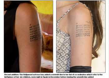 Potrivit DailyMail, actrita si-a tatuat noi coordonate, ceea ce ne face sa ne intrebam ori este pe punctul de a adopta inca un copil, ori sunt coordonatele locului unde s-a nascut Brad Pitt.