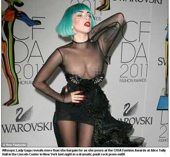Aceasta a venit la petrecerea organizata in urma evenimentului CFDA Fashion Awards imbracata intr-un costum de tip plasa care lasa totul la vedere. Totusi, cantareata si-a acoperit partile intime cu o pereche de bikini cu tinte si pe sani si-a aplicat doua cerculete.