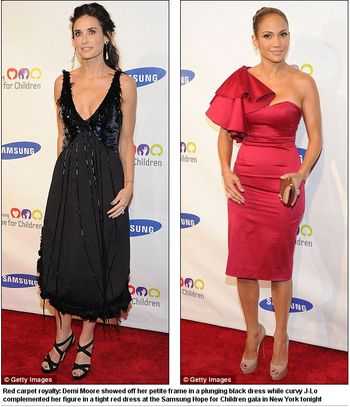 Demi Moore a ales o rochie neagra lejera, in timp ce Jennifer Lopez, cunoscuta pentru formele sale voluptoase, a ales sa poarte o rochie rosie cambrata pe corp, scrie DailyMail.