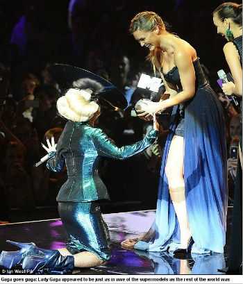 Cantareata s-a tinut de sotii si in momentul in care i-a fost inmanat premiul pentru "cea mai buna cantareata”. Uimita de prezenta sexy a supermodelelor Irina Shayk si Bar Refaeli, Lady Gaga a ingenunchiat in fata celor doua frumuseti.