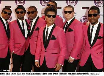 - Si Bruno Mars s-a asortat cu covorul. Atat cantaretul, cat si colegii sai de trupa, au optat pentru un sacou roz.