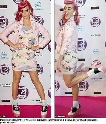 Astfel, Katy Perry si-a facut aparitia la marea gala de aseara intr-o rochie scurta in tonuri vesele si cu parul vopsit roz.
