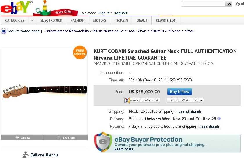 Un vanzator de pe eBay anunta ca pune la licitatie gatul chitarei pe care Kurt Cobain a distruso in timpul concertului Nirvana de la Hollywood Rock Festival, Brazilia, in 16 ianuarie 1993.