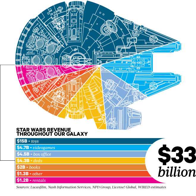 Cea mai mare bucata din aceasta suma, 15 de miliarde, a fost obtinuta din lansarea si comercializarea jucariilor din universul Razboiul Stelelor.