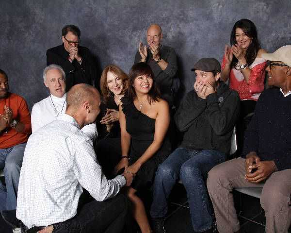 "Incepuse de 30 de minute sedinta respectiva. Fata s-a dus sa se aseze intre Patrick Stewart si Jonathan Frakes dar fotograful i-a spus sa stea in fata. Noi am incercat sa ne dam seama ce se intampla. Apoi fotograful i-a spus: 'Eu chiar iubesc Star Trek, dar te iubesc pe tine mai mult'.