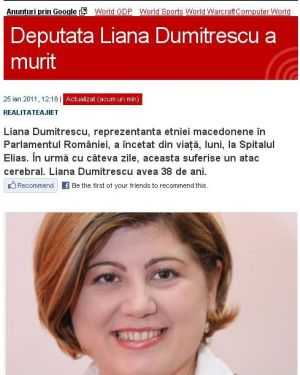 Liana Dumitrescu, care reprezinta etnia macedoneana in Parlament, a mers, in urma cu o saptamana, la Spitalul Elias, acuzand dureri puternice de cap. Starea sa s-a agravat in orele urmatoare, medicii fiind rezervati in privinta evolutiei ulterioare, declarau surse apropiate familiei.