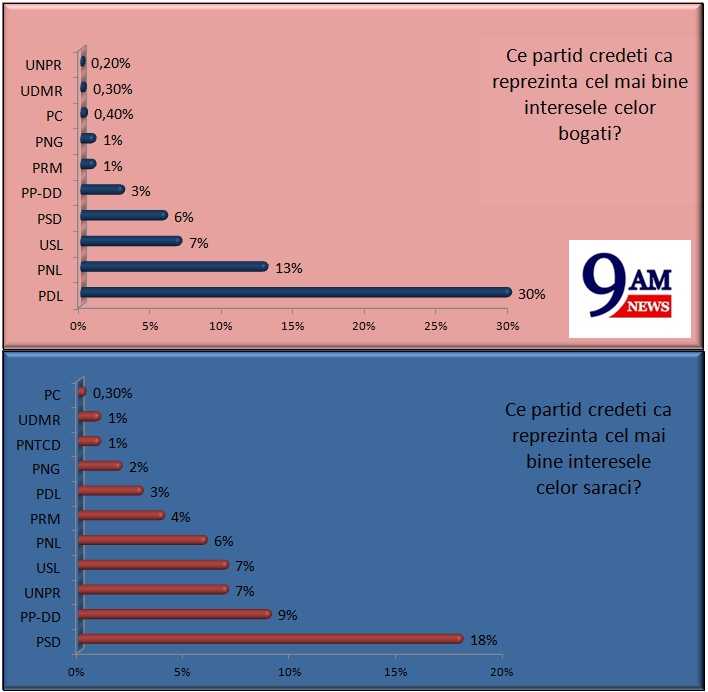 La intrebarea “Dintre partidele si aliantele politice din Romania, care credeti ca reprezinta cel mai bine interesele celor bogati si foarte bogati?”, 30% au raspuns PDL, 13% PNL, 7% USL, 6% PSD, 3% PP-DD, cate 1% PRM si PNG, 0,4% PC, 0,3% UDMR si 0,2% UNPR.