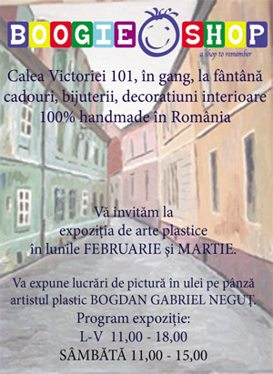 Primul artist plastic care va expune in magazinul Boogie Shop este Bogdan Gabriel Negut. Lucrarile sale sunt realizate in tehnica ulei pe panza, iar expozitia lui este cu vanzare, care insa va sustine un scop caritabil. Picturile sale sunt dominate de peisaje urbane: strazi, cladiri, case, fara oameni, deoarece Bogdan este un iubitor al arhitecturii urbane. Iubirea lui pentru pictura s-a nascut in timpul liceului, pictand pe coli de desen care se stricau destul de repede pentru ca se imprima uleiul pe verso si mai apoi pe cartoane, decupate din cutii. Pictorul sau preferat ramane unul dintre cei mai celebri pictori francezi, nascut in Montmartre, Maurice Utrillo.