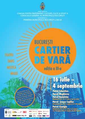 - Duminica, 17 iulie, dimineata de la ora 10.00, in Parcul Sebastian publicul se intalneste cu Teatrul Excelsior si a lor Veselie in vacanta. Seara de la ora 20.00, Teatrul Mic aduce si in acest cartier comedia muzicala Ludwig, Nicolo & Jo.