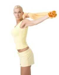 Aceste exercitii sunt indicate femeilor care petrec mult timp la birou. Se prinde intre maini un prosop sau un cordon si se trimite din fata in spate si invers, astfel incat sa nu dati drumul cordonului si sa nu indoiti bratele. Ideal este sa ajungeti la o distanta intre pumni egala cu cea a umerilor, dar aceasta dupa multe serii de exercitii.