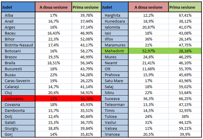 - Potrivit Adevarul, in sesiunea a II-a, promovabilitatea pe judete a fost urmatoarea:
