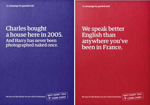 "We may not like Britain, but you will love Romania. Why don't you come over?" ("S-ar putea sa nu ne placa Marea Britanie, dar voi o sa iubiti Romania. De ce nu veniti la noi?") este sloganul campaniei gandul.info dedicate englezilor si prejudecatilor despre Romania.