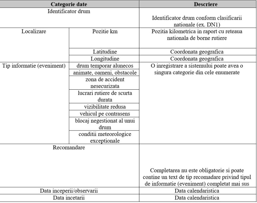 Compania Națională de Administrare a Infrastructurii Rutiere (CNAIR) a transmis pentru sursa menționată cum arată, pentru moment, structura datelor pe care le colectează în cadrul Punctului Național de Acces.