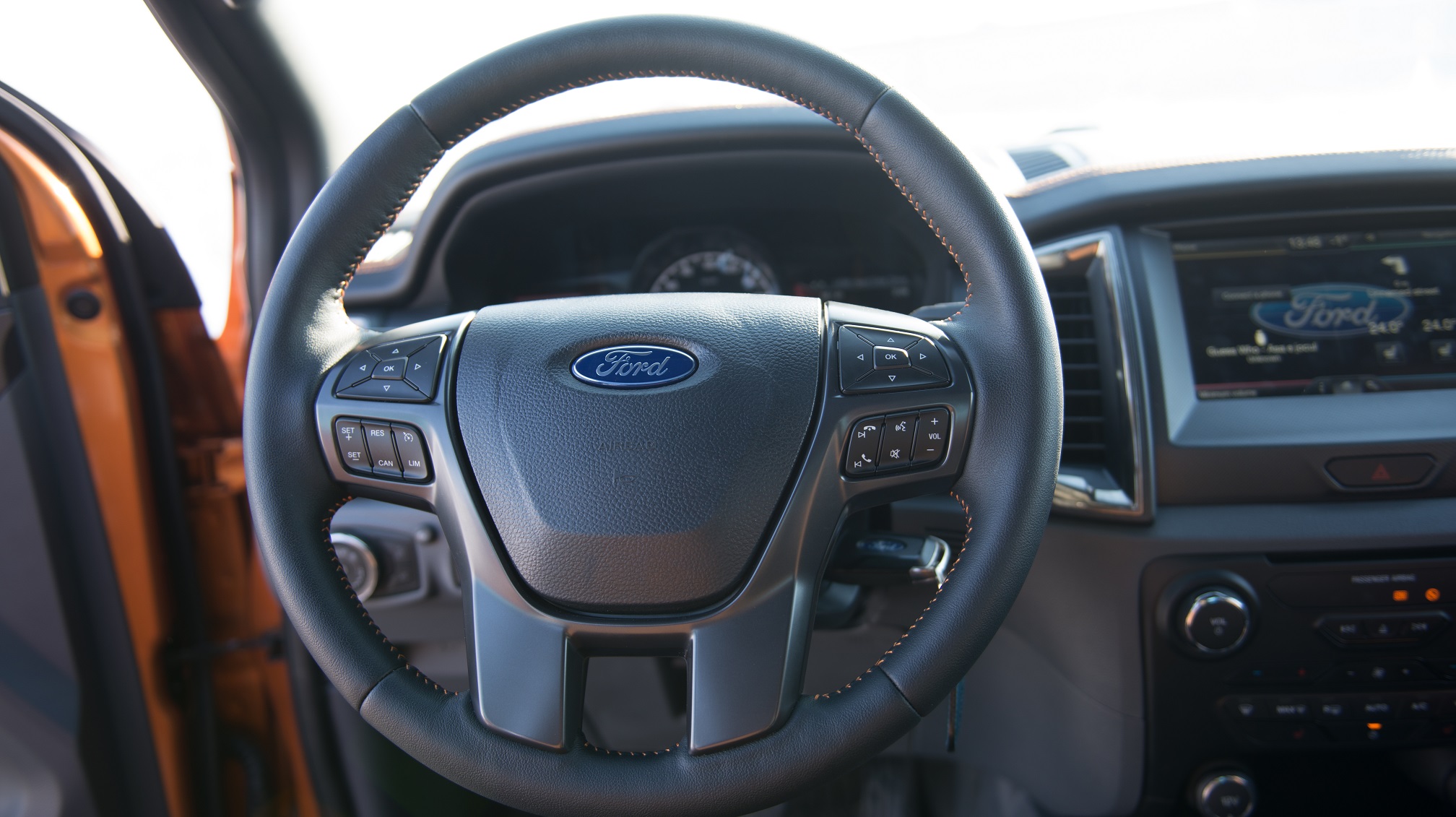 Da, pe Ford Ranger Wildtrak am gasit cel mai bun volan pe care eu am pus mana pana acum (luati in calcul si faptul ca n-am condus inca Seria 7, Audi A8 sau Mercedes S-Klasse, desi urmeaza si acestea la test). O reala placere sa-ti tii mainile permanent volan, lucru care m-a facut sa uit un pic de consola centrala cu touch, dar despre asta vorbim un pic mai jos. Butoanelede pe volan sunt organizate logic, asa ca iti vei intra in mana repede cu ele si sunt placute la atingere, asa ca nu le vei mai incurca dupa ceva timp.