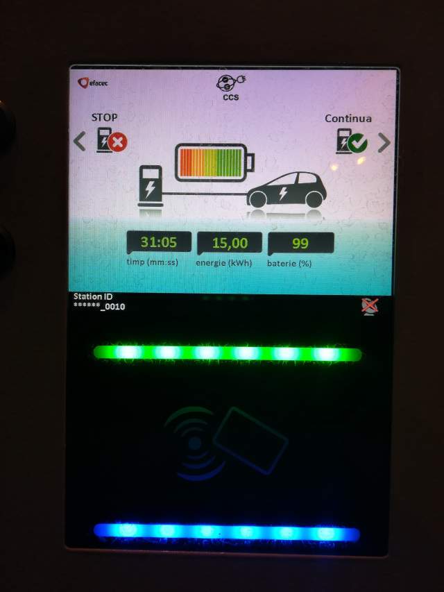 Am pus masina la incarcat in Pitesti, unde am ajuns cu o rezerva de 102 de km in baterie. Mult mai mult decat ma asteptam. Eu eram ferm convins ca voi ajunge cu maxim 10-20 de km ramasi. In 30 de minute bateria a fost incarcata complet, timp in care am avut timp sa mananc o prajitura buna si sa beau o cafea.