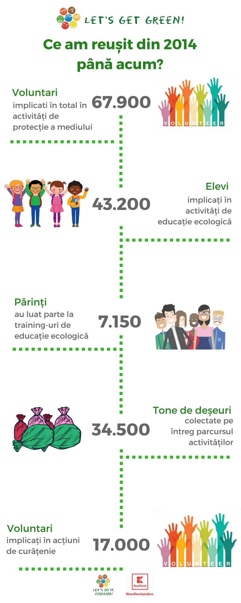 “Let’s Get Green!” este organizat de echipa “Let`s Do It, Romania!”. In cele 3 editii anterioare desfasurate in regiunea Dunarii, au fost implicati peste 43 200 de elevi in activitati de educatie ecologica, 7150 parinti au luat parte la training-uri de educatie ecologica, 17 000 de voluntari au strans peste 34 500 de deseuri in mai multe zile de curatenie. Proiectul este realizat cu sprijinul Ministerului Mediului, Apelor si Padurilor si Kaufland Romania.