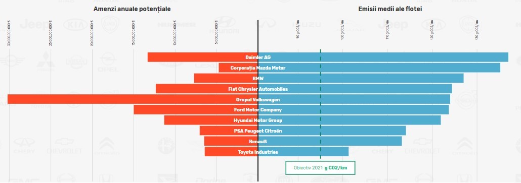 - Cercetările arată că primii zece producători de autovehicule riscă amenzi cumulate de 11,4 miliarde EUR în 2021, dacă nu își vor reduce drastic amprenta de carbon.
