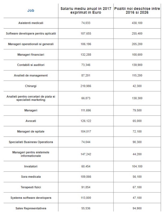 Locurile de muncă în domeniile medical și tehnologic se clasează în topul celor mai bine plătite meserii, notează Inc. Magazine. Folosindu-se de analiza realizată de Biroul de Statistică a Forței de Muncă din Statele Unite și de câștigurile medii anuale estimate de aceeași instituție, publicația a realizat un top al meseriilor bănoase din viitor.